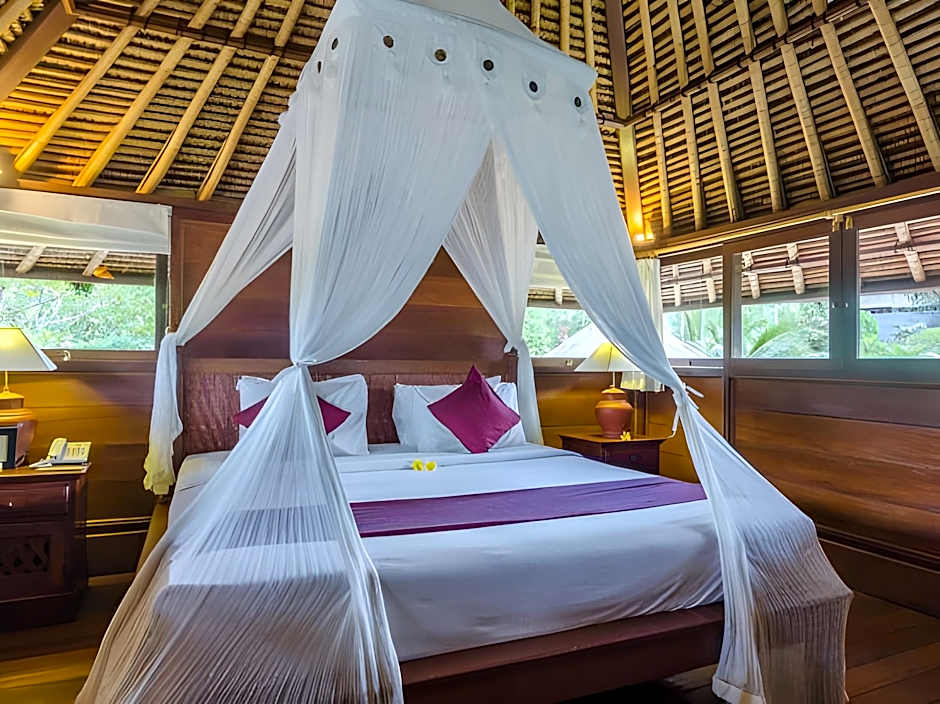 A simple bungalow featuring air conditioning, a private living and dining area. They come with flat-screen satellite TVs, writing desks and well-equipped kitchens.